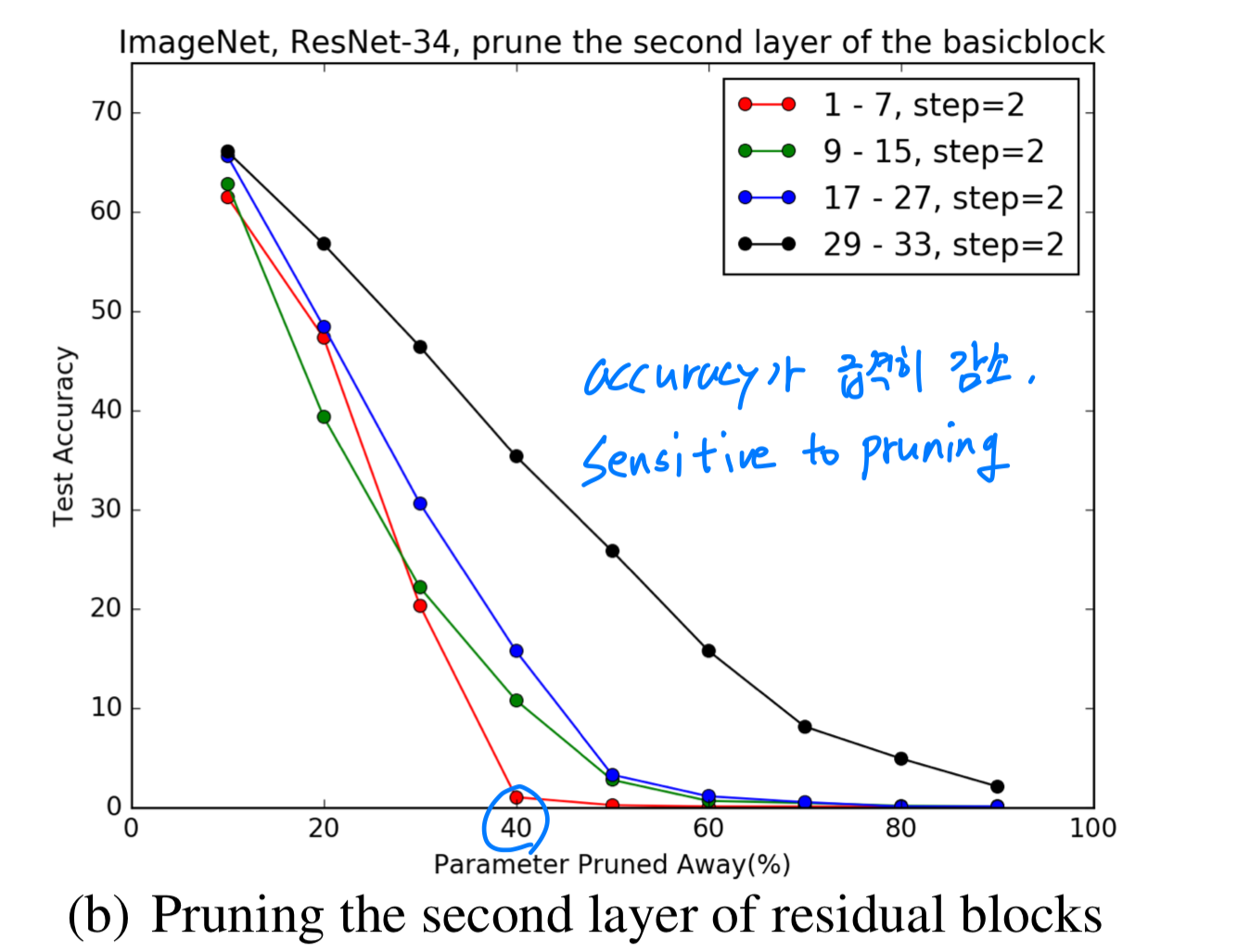 게다가 우리는 deeper layer들이 earlier layer들보다 더욱 pruning에 sensitive하다는 것을 알아냈다.
