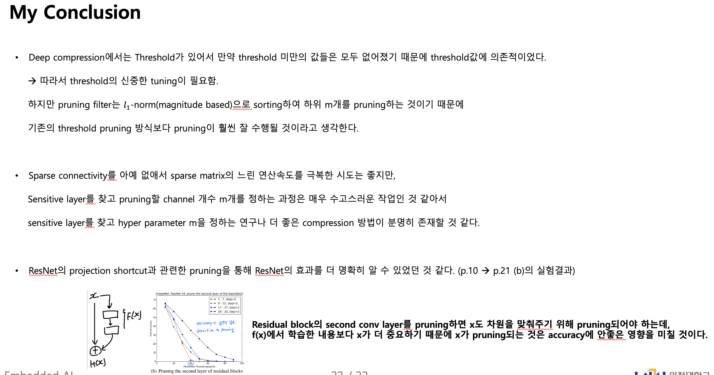 최근 original accuracy 손해 없이 layer들의 weight들을 purning하고 compressing하여 이러한 overhead를(computation과 parameter stroage cost 증가) 줄이는 연구가 활발히 진행되고 있다.