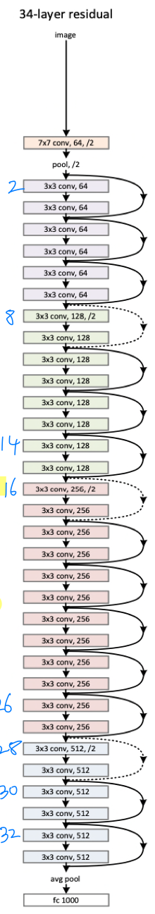 각 stage의 the first and the last residual block(layer 2, 8, 14, 16, 26, 28, 30, 32)은