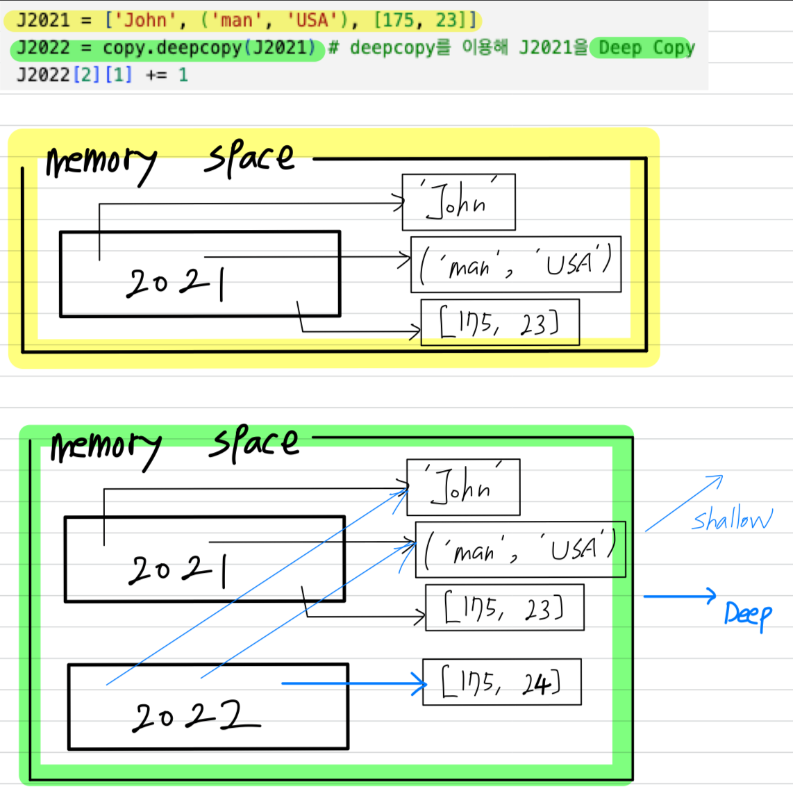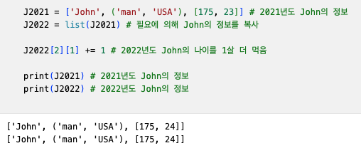 아래 그림과 같이 immutable object인 string('John')과 tuple(('man', 'USA'))는 Shallow Copy,