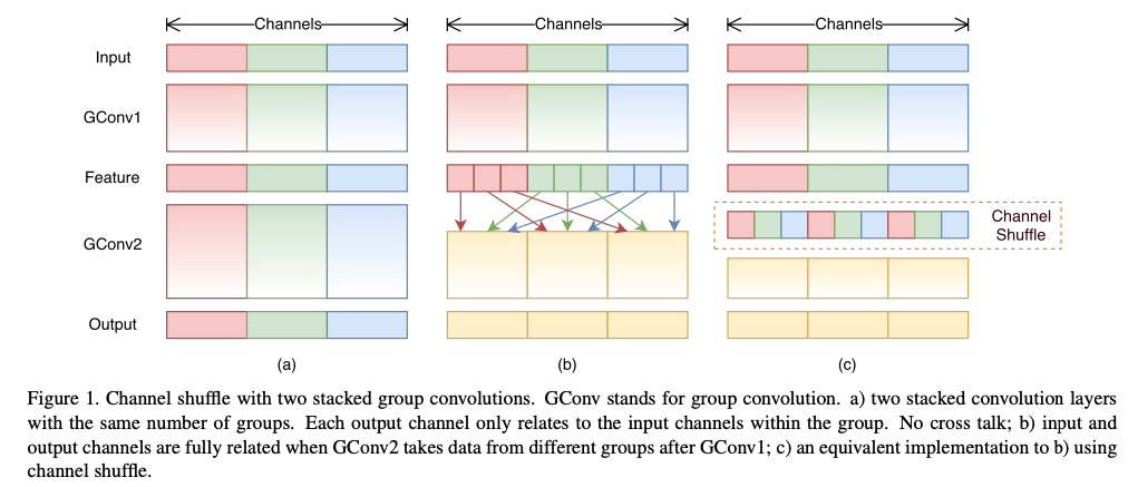 group conv의 부정적 영향을 극복하기 위해 feature channels들 간의 정보 흐름을 도울 수 있는 a novel channel shuffle operation을 제안한다.