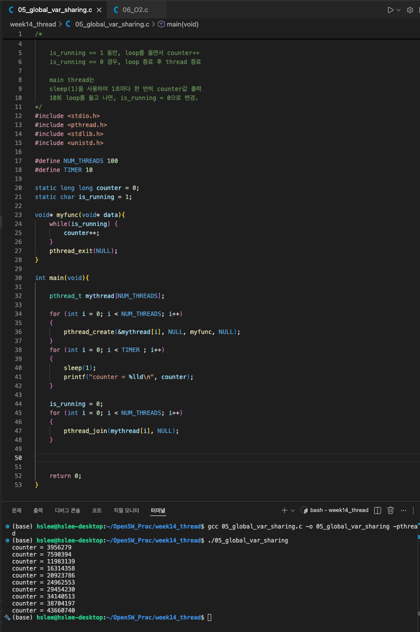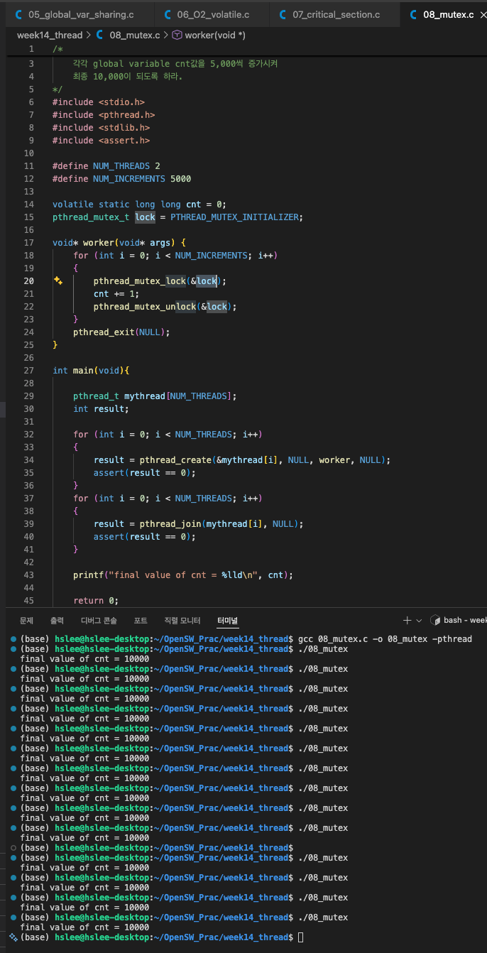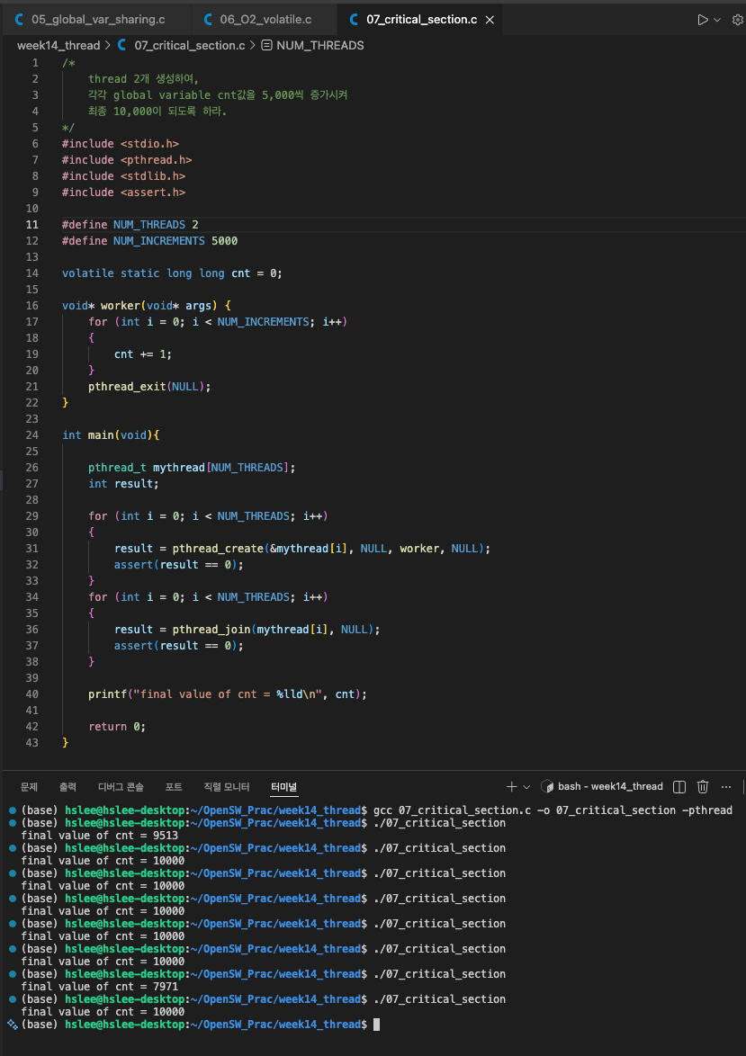 위 문제를 해결하기 위해, 각 thread에서는 global variable인 sum에 직접 값을 더하는게 아니라,