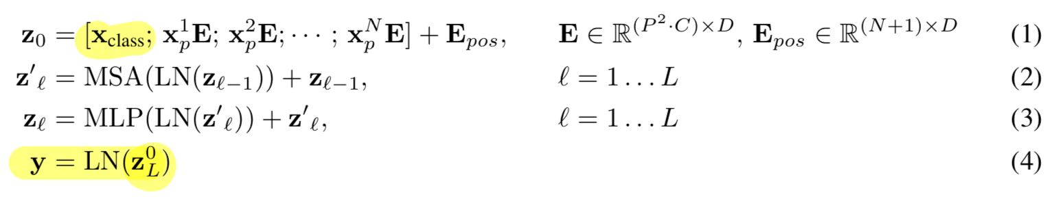 transformer의 encoder의 output에서 이 embedding의 상태(zL0)가 image representation인 y로 작용한다. (Eq. 4)