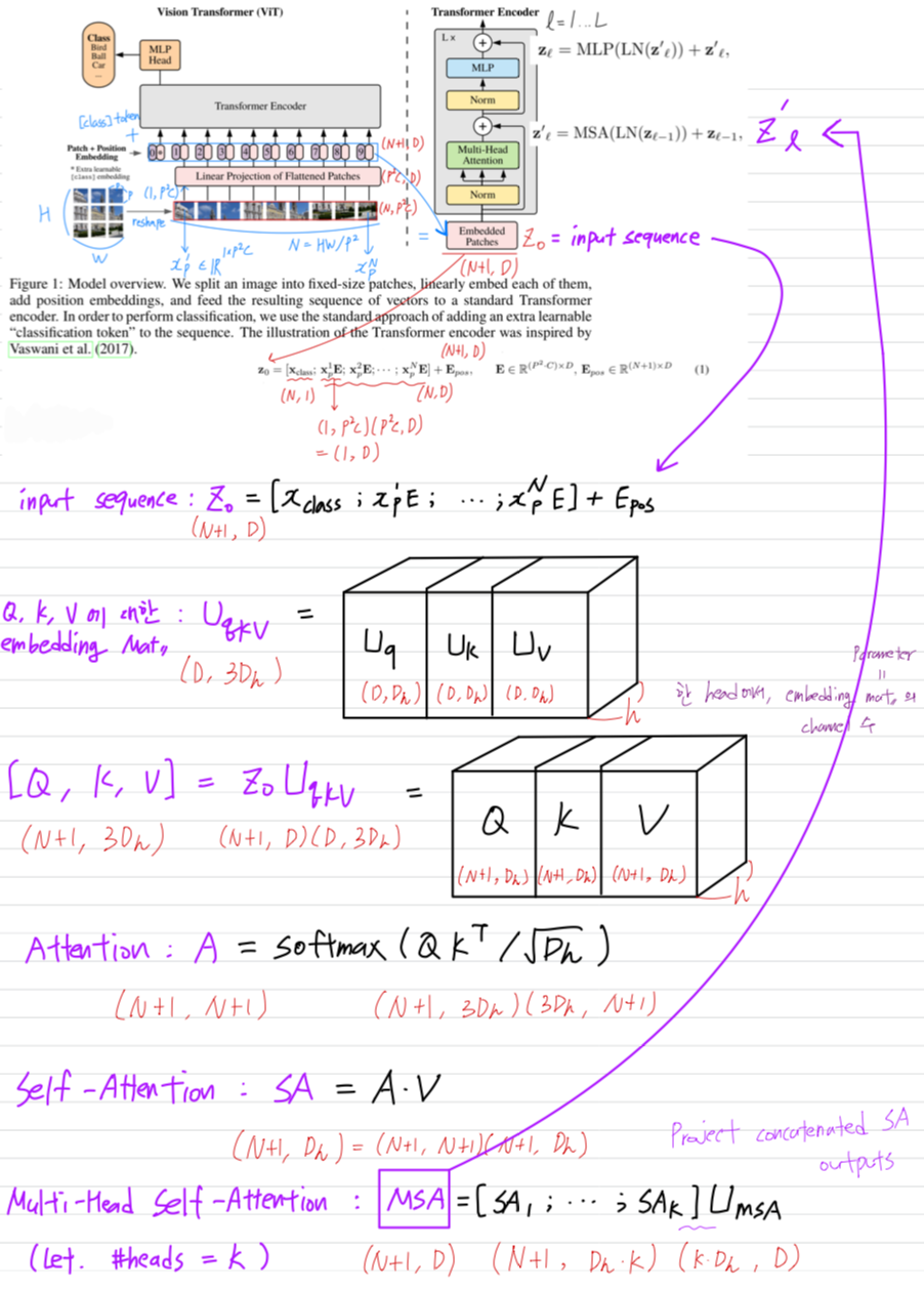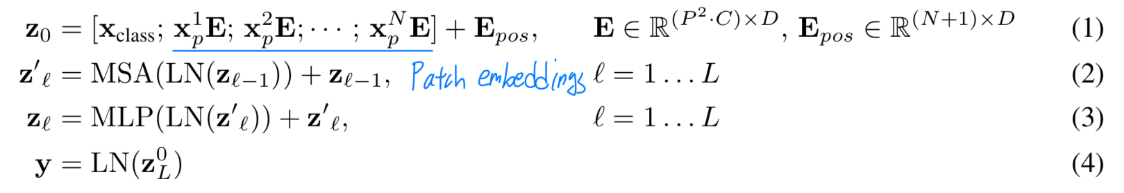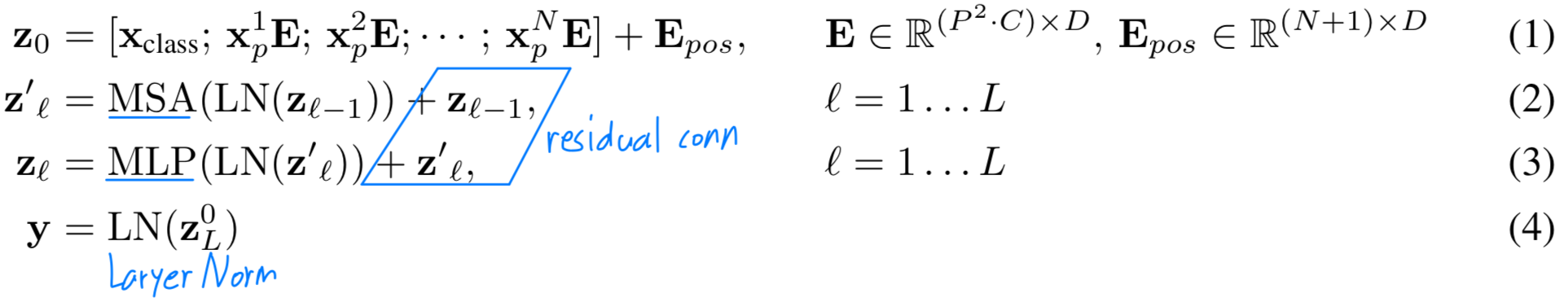 Transformer encoder는 multihead self-attention(MSA)와 MLP blocks이 번갈아 나타나는 layer로 구성된다.