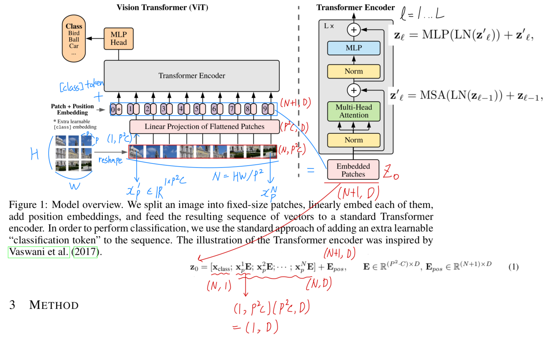 BERT의 [class] token과 유사하게, 우리는 embedded patches의 sequence에 학습 가능한 embedding을 앞에 추가했다. (z00=xclass)