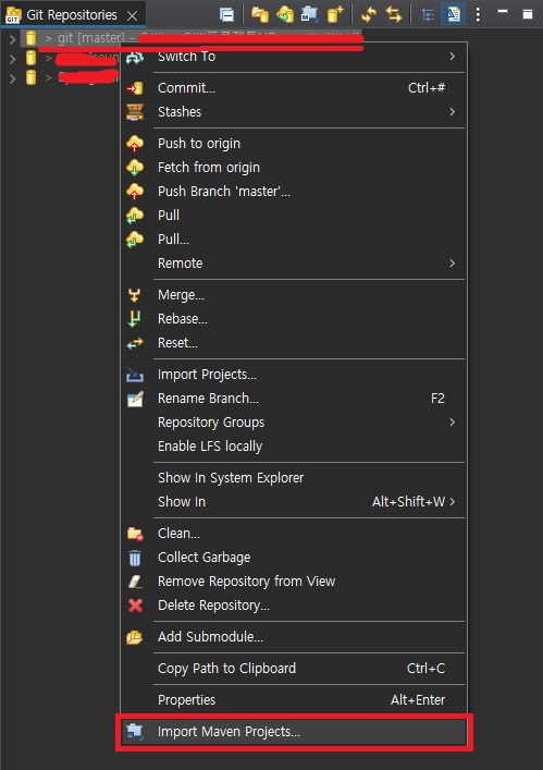 - Git Repositories 탭에서 내려받을 프로젝트를 선택하고 우클릭 ▶ Import Maven Projects 메뉴를 선택합니다.