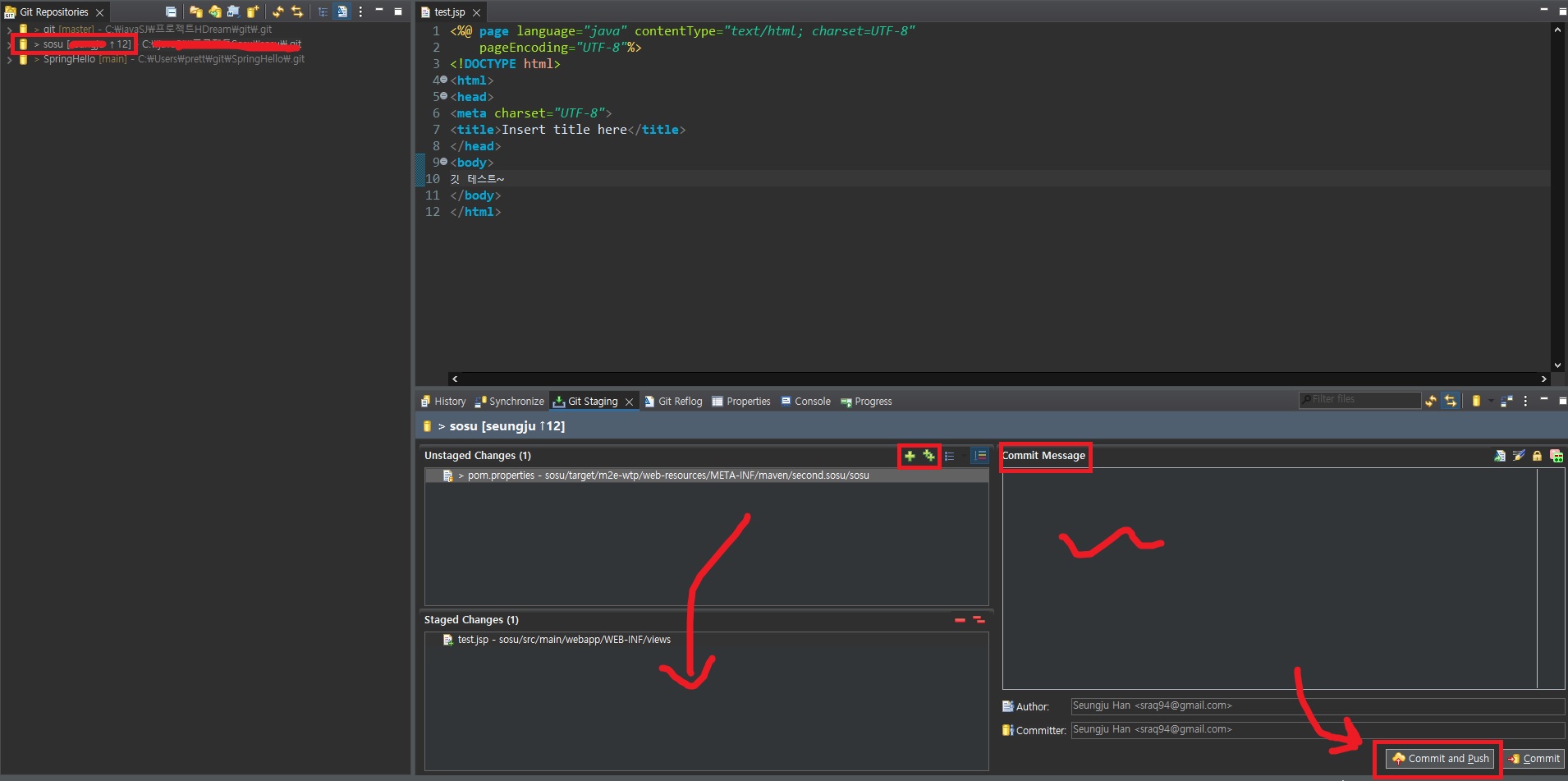 git staging 탭에서 변경한 파일 staged changes 창으로 이동