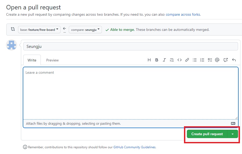- 풀 리퀘스트 요청을 보내는 이유를 작성하고 create pull request 버튼을 클릭