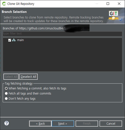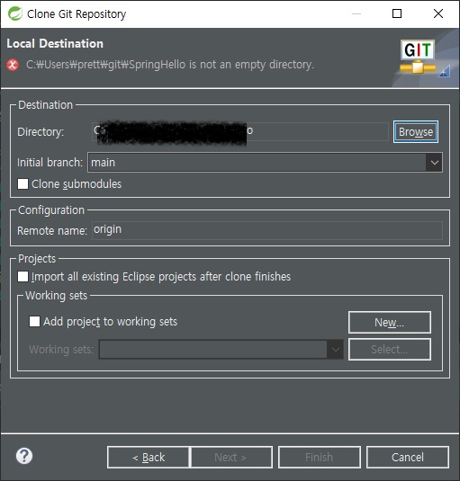 - Directory란에 github의 원격 저장소와 연결할 로컬 저장소 경로를 입력하고 Finish 버튼을 클릭합니다.