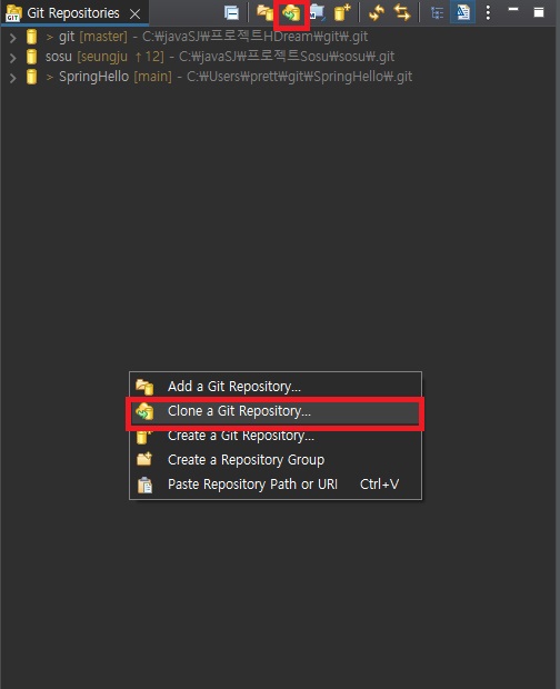 - Git Repositories 탭에서 Clone a Git Repository 아이콘을 클릭
