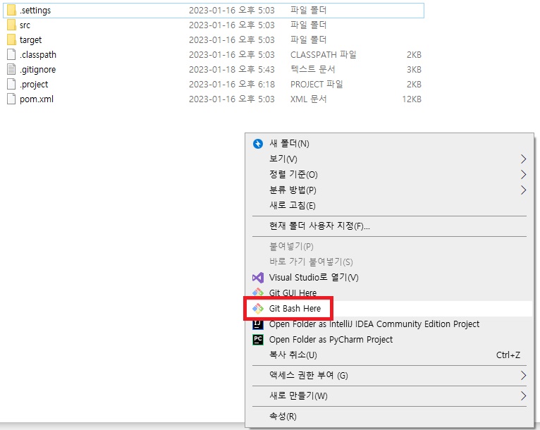 프로젝트가 있는 경로에 우클릭을 눌러서 git bash를 실행한다.