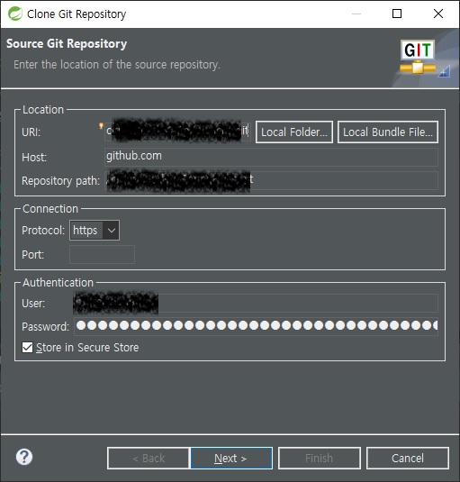 - 복사한 레포지토리(Repository) 주소를 URI란에 붙여 넣고, github 사용자 정보를 입력한 후 Next 버튼을 클릭합니다.