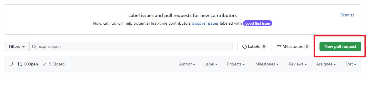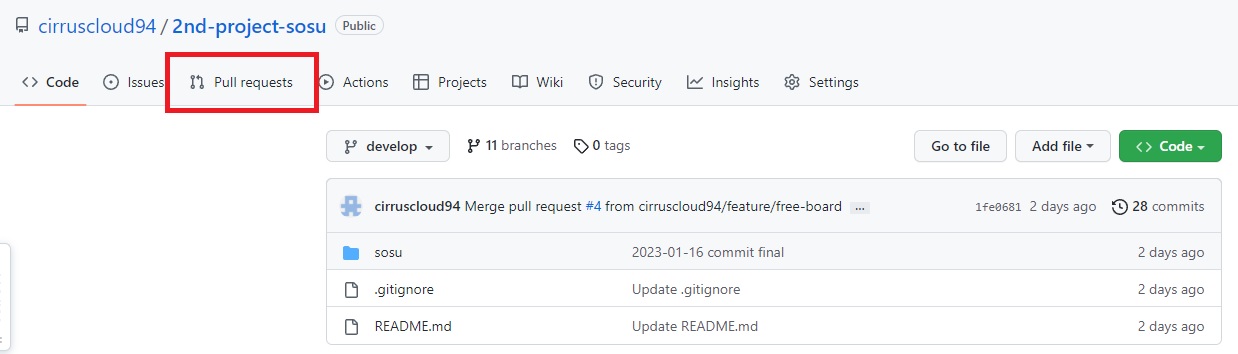 - 공용 리포지토리로 들어가서 Pull Request 탭을 선택