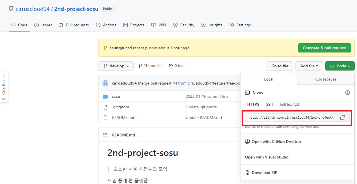 - github에서 fork한 내 레포지토리(Repository) 주소를 복사합니다. (깃허브 레포지토리 우측 상단 code)