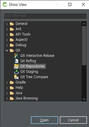 - Git ▶ Git Repositories 메뉴를 선택하고, Open 버튼을 클릭합니다.
