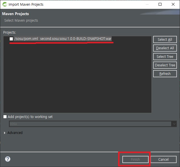 - Import source 경로를 확인하고, Finish 버튼을 클릭합니다.
