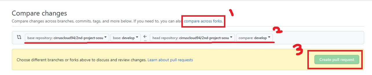 - compare across forks 를 누르면 자신의 리포지토리를 비교할 수 있다