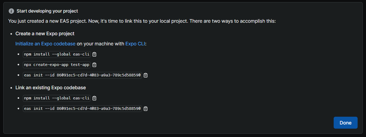 프로젝트 생성이 완료되면 아래의 명령어로 프로젝트 id를 입력해 공식 홈페이지의 프로젝트와 동기화한다.
