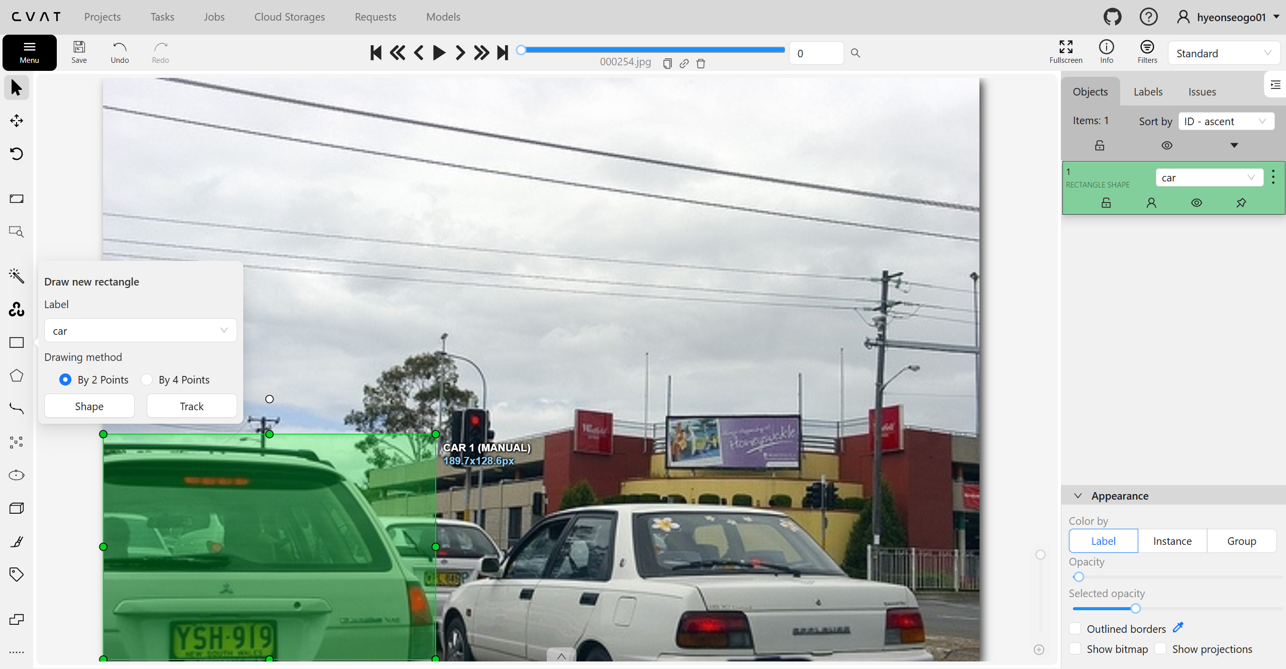 원하는 범위만큼 Box를 그려 라벨을 지정한다.