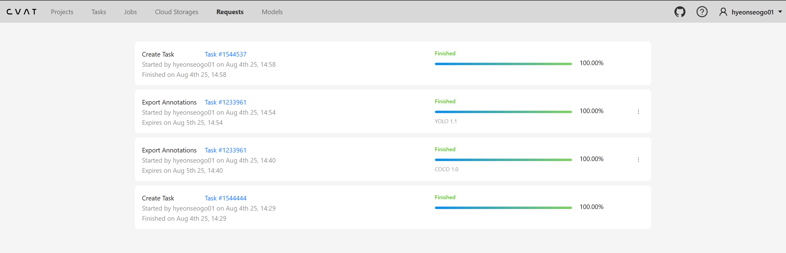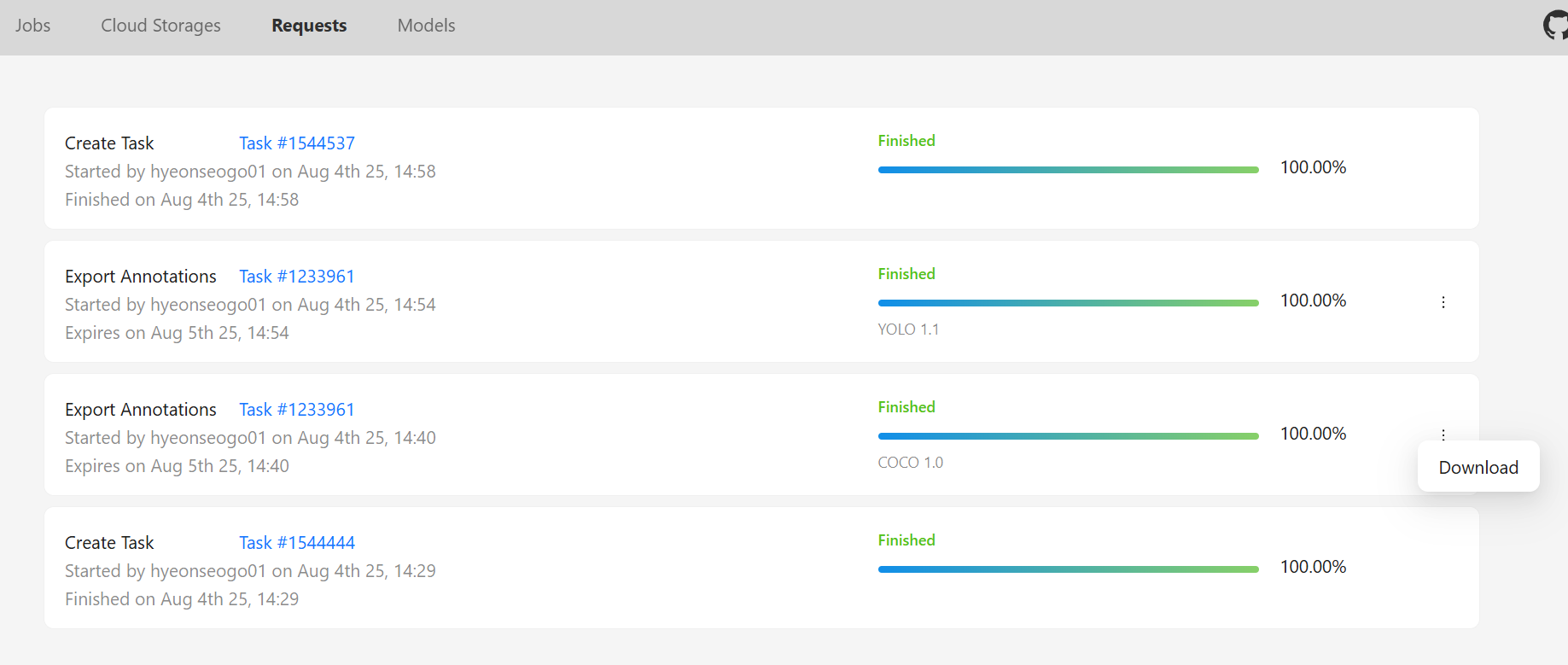 그리고 상단 Requests에 들어가서 Download를 진행한다.
