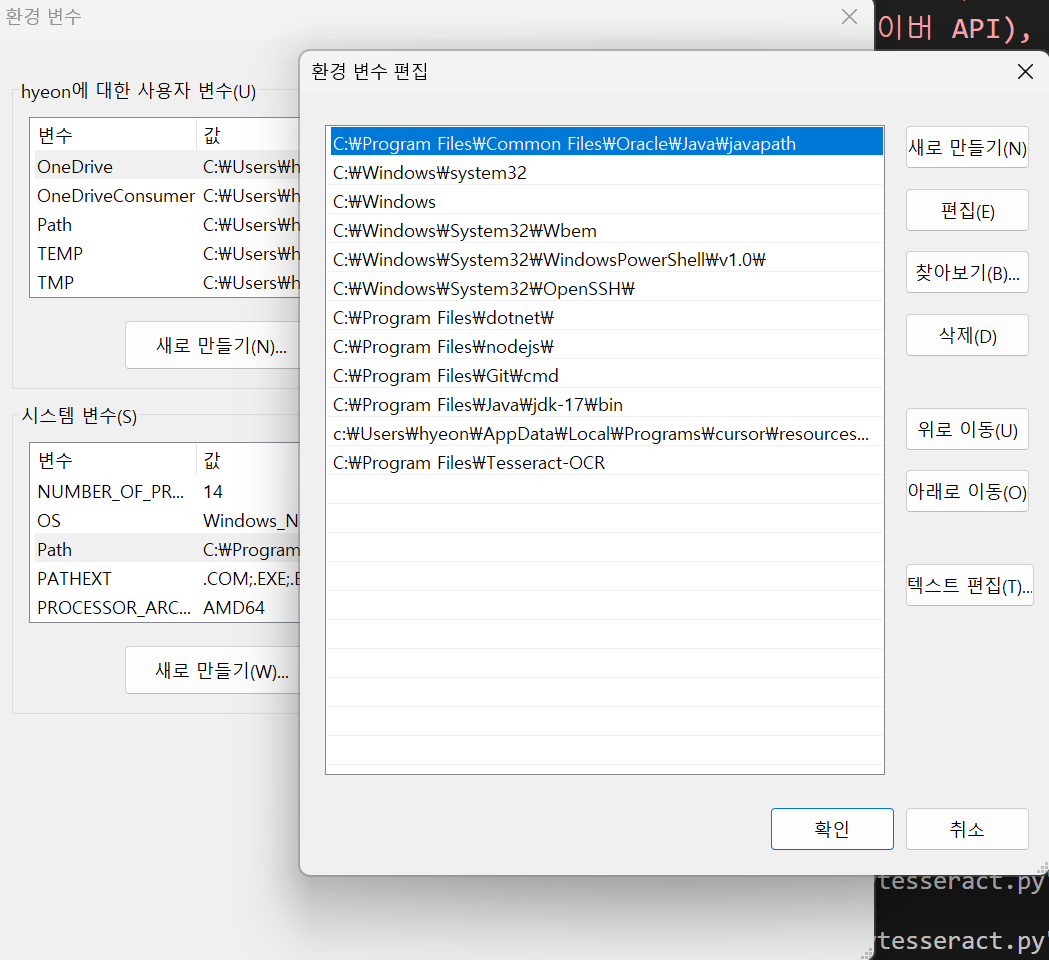- Windows "고급 시스템 설정"에서 Tesseract 실행파일 경로를 환경변수로 등록