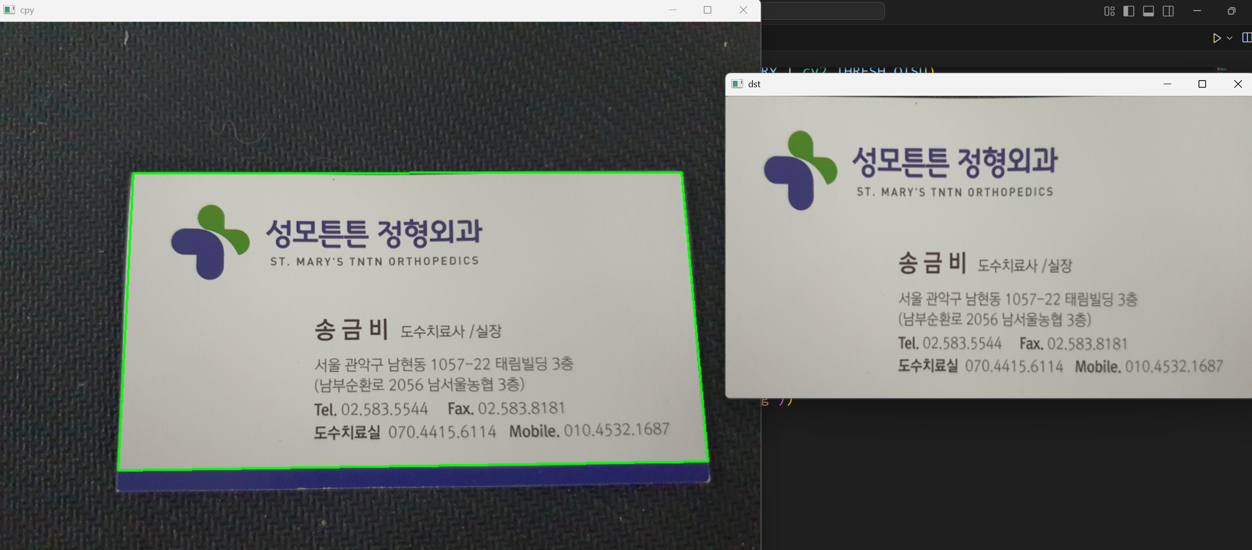 # 위쪽이 먼저 와야 하므로 y값(1번 인덱스)이 작은 쪽이 pts[0]이 되도록 바꿈.