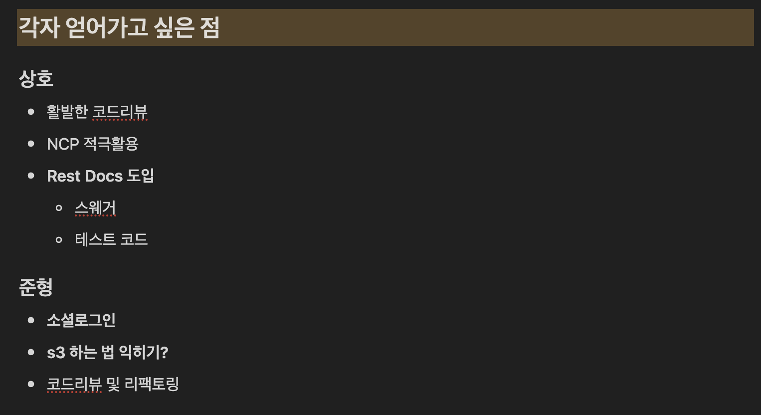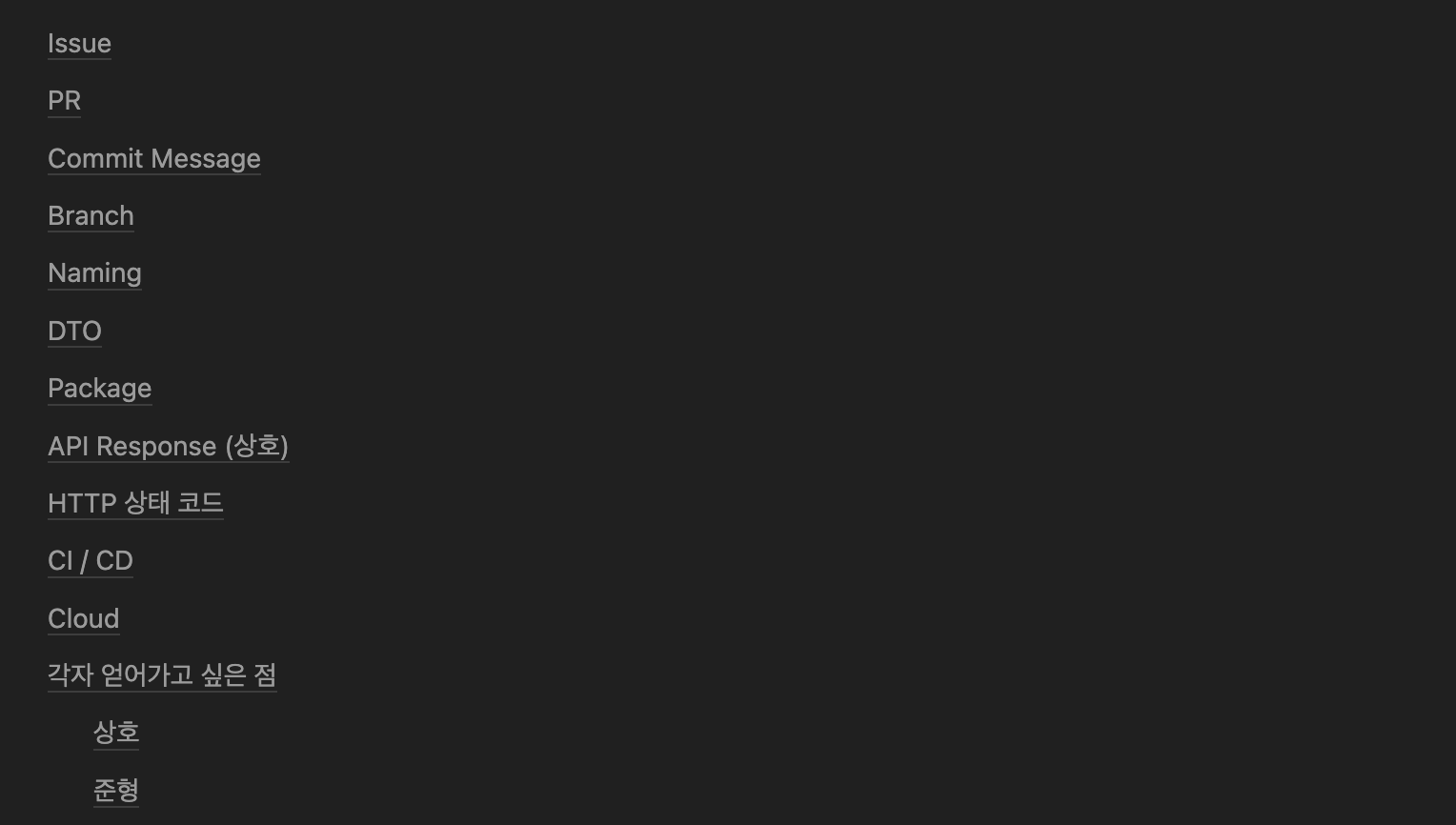 템플릿 및 PR 룰 설정, 패키지 & 응답 구조, CI/CD 방식 등을 정했고, 마지막으로 각자 얻어가고 싶은 점들을 공유했다.