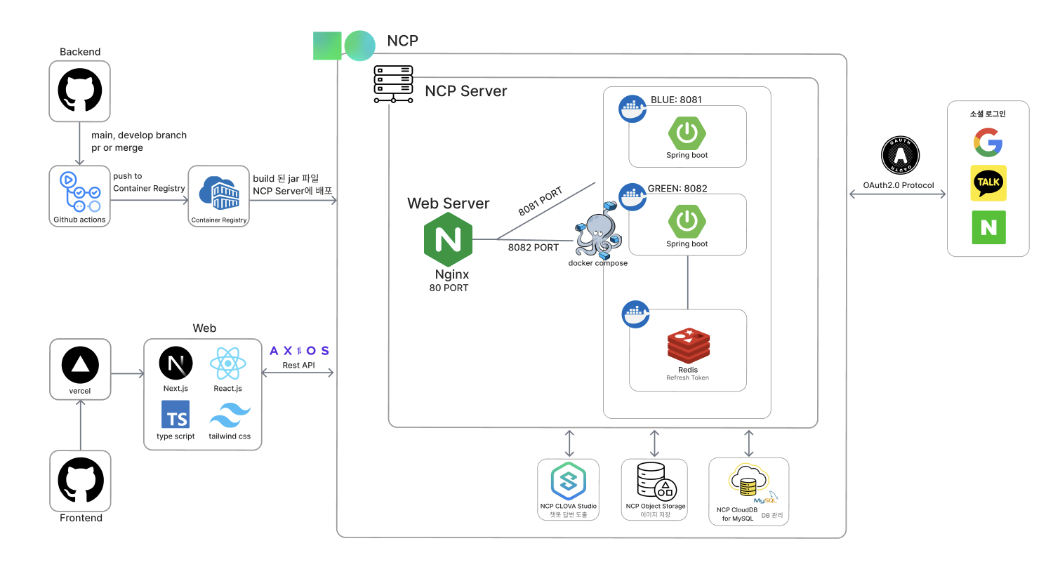 위와 같았는데, 공통적으로 코드리뷰와 리팩토링에 열망이 있었고 테스트코드의 필요성도 느끼고 있었다. 또한 이번 30기도 NCP와 협업을 진행하며 감사하게도 크레딧 100만원을 받을 수 있었기에, 이를 잘 활용해서 아키텍처에도 많은 고민을 해 보고 싶었다.