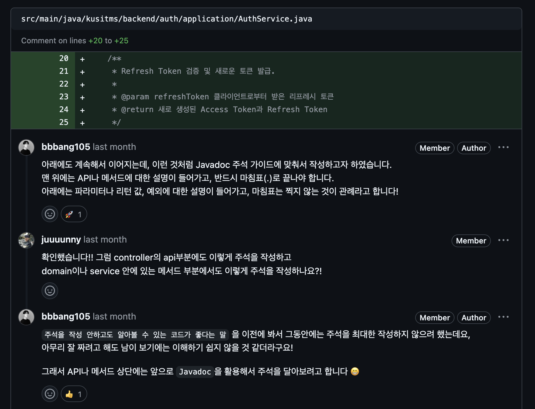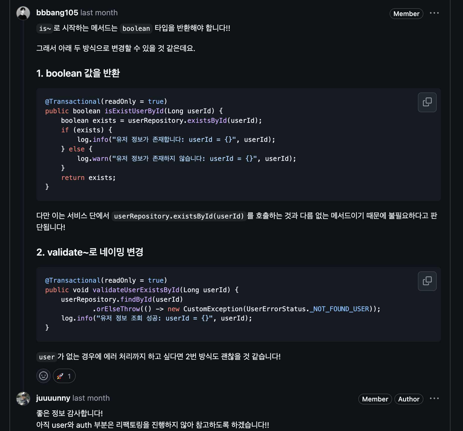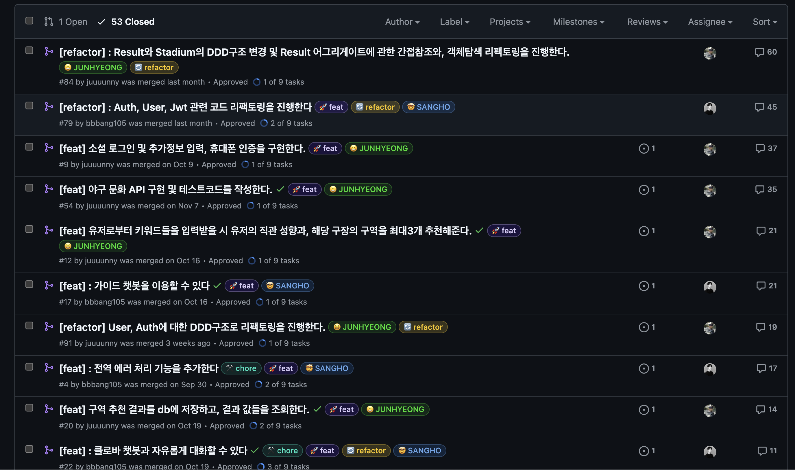 위에서 많이 말했던 것처럼 이번에는 함께 한 준형이형과 거의 매일 연락하고 PR에서 코멘트를 남기며 적극적으로 코드리뷰를 진행했다. 간단한 PR이어도 꼭 확인하고 Approve를 하도록 하여 상대가 작성한 코드여도 이해하고 넘어가도록 했다.