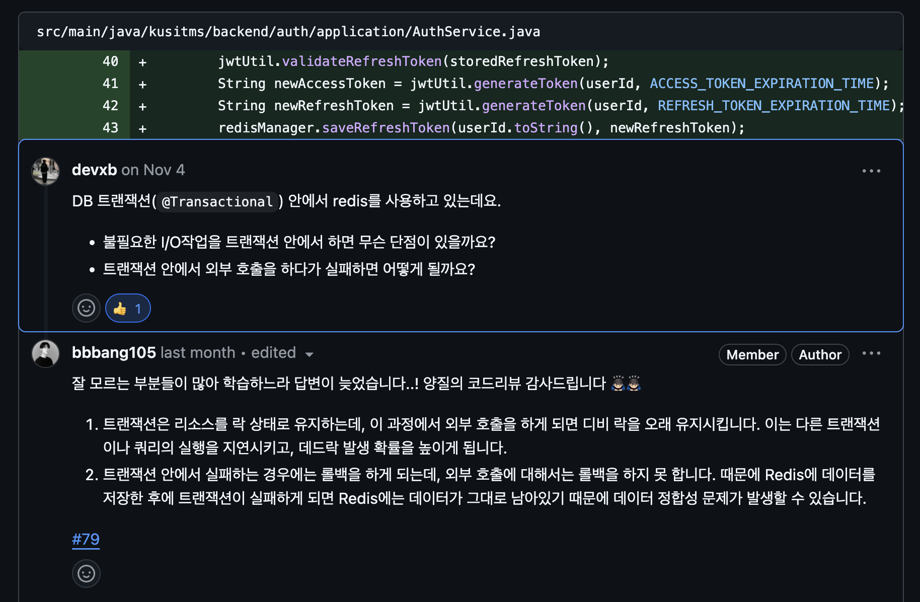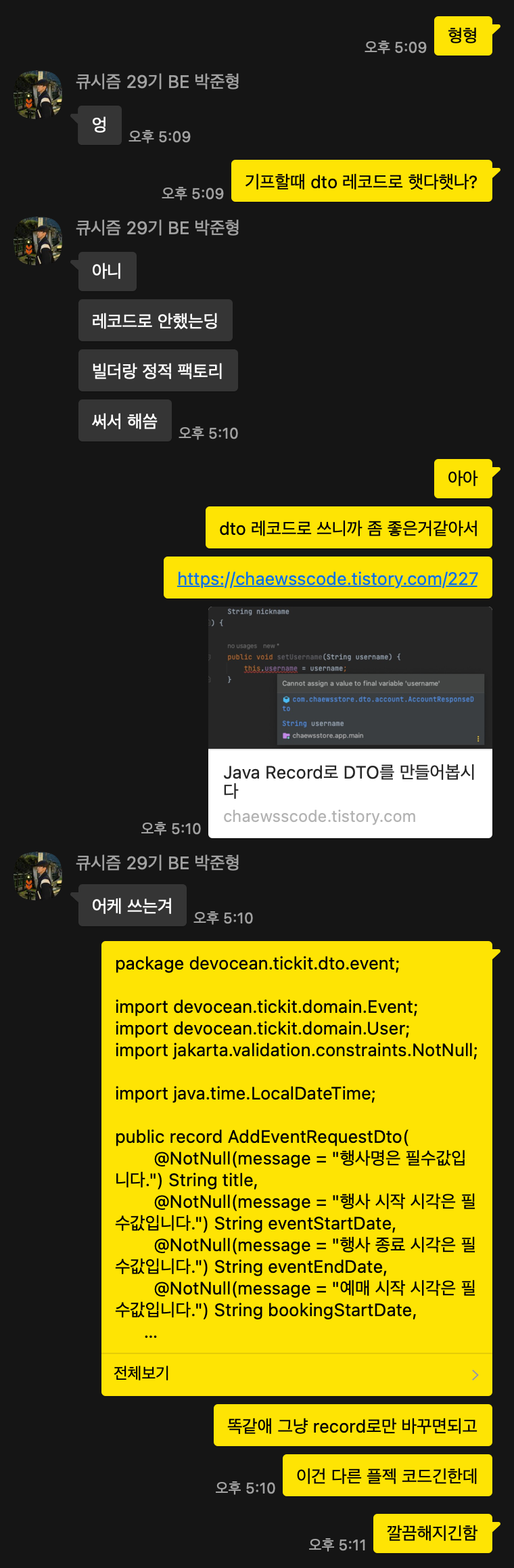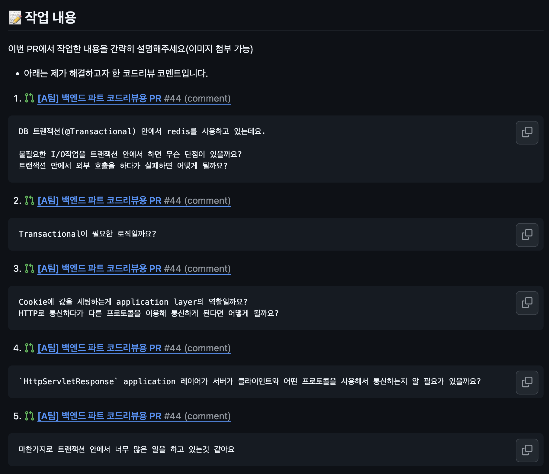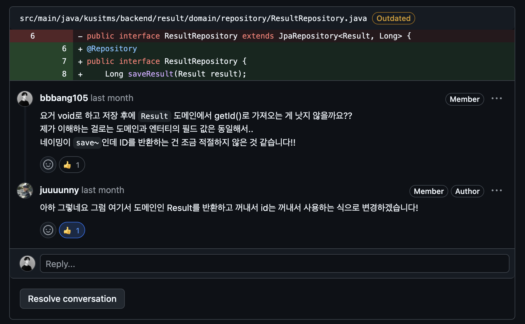 위에서 많이 말했던 것처럼 이번에는 함께 한 준형이형과 거의 매일 연락하고 PR에서 코멘트를 남기며 적극적으로 코드리뷰를 진행했다. 간단한 PR이어도 꼭 확인하고 Approve를 하도록 하여 상대가 작성한 코드여도 이해하고 넘어가도록 했다.