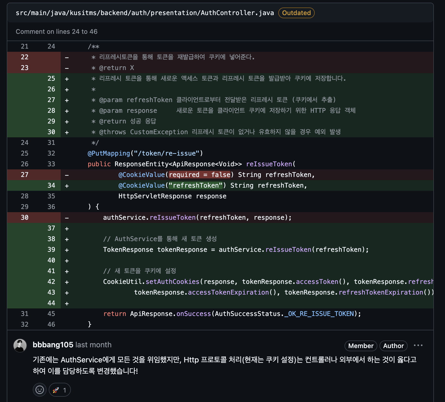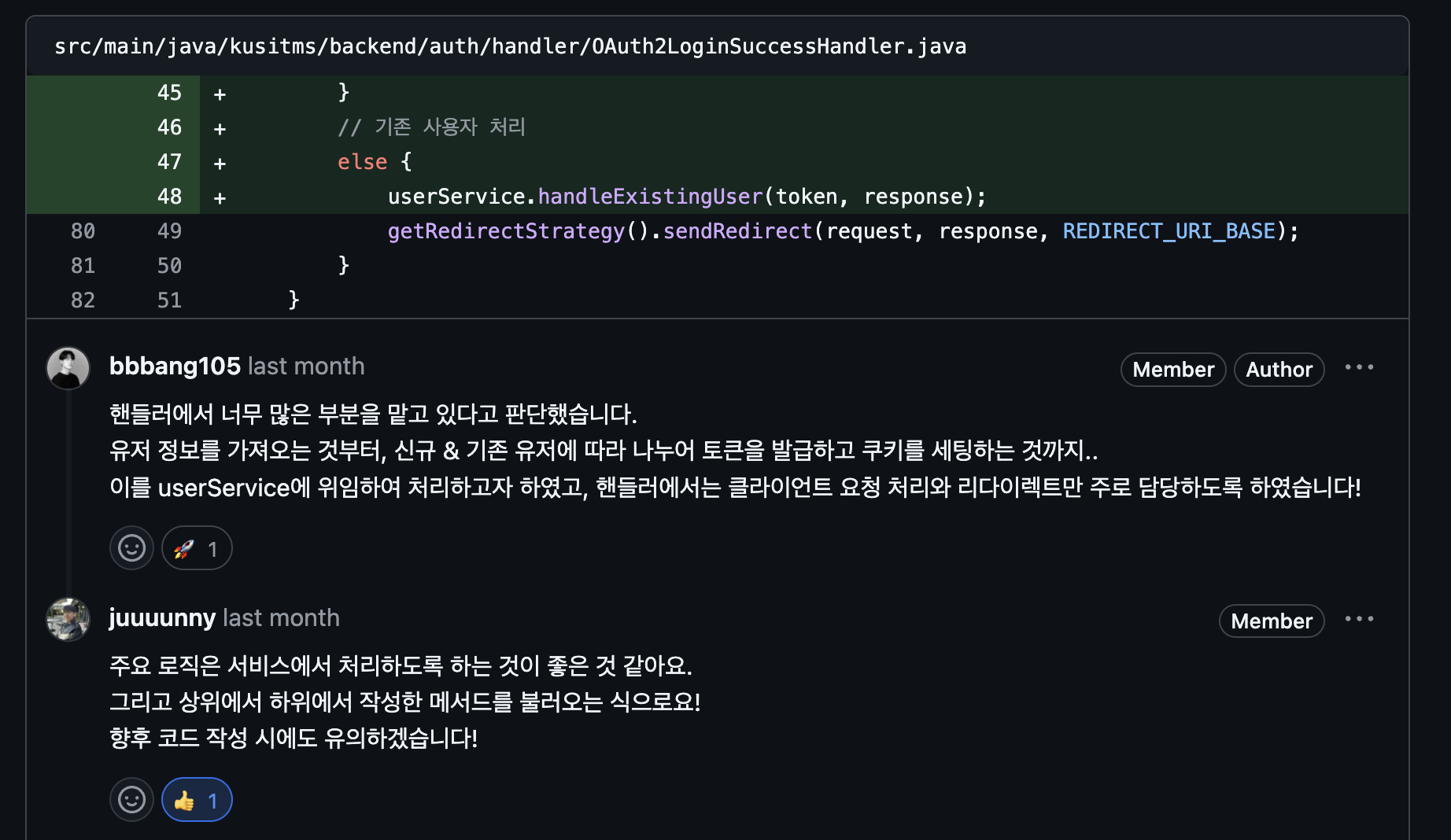 이전에는 대부분의 로직을 서비스에 두고, 컨트롤러에서는 요청을 받고 서비스로 넘겨 다시 응답을 반환하는 역할만을 주었다. 반면 이번에는 리팩토링을 하며 HTTP 프로토콜(쿠키 설정)은 컨트롤러 단에서 처리하는 것이 낫다는 것도 알게 되었고, 핸들러에 있는 과도한 역할을 나누어 보기도 했다.