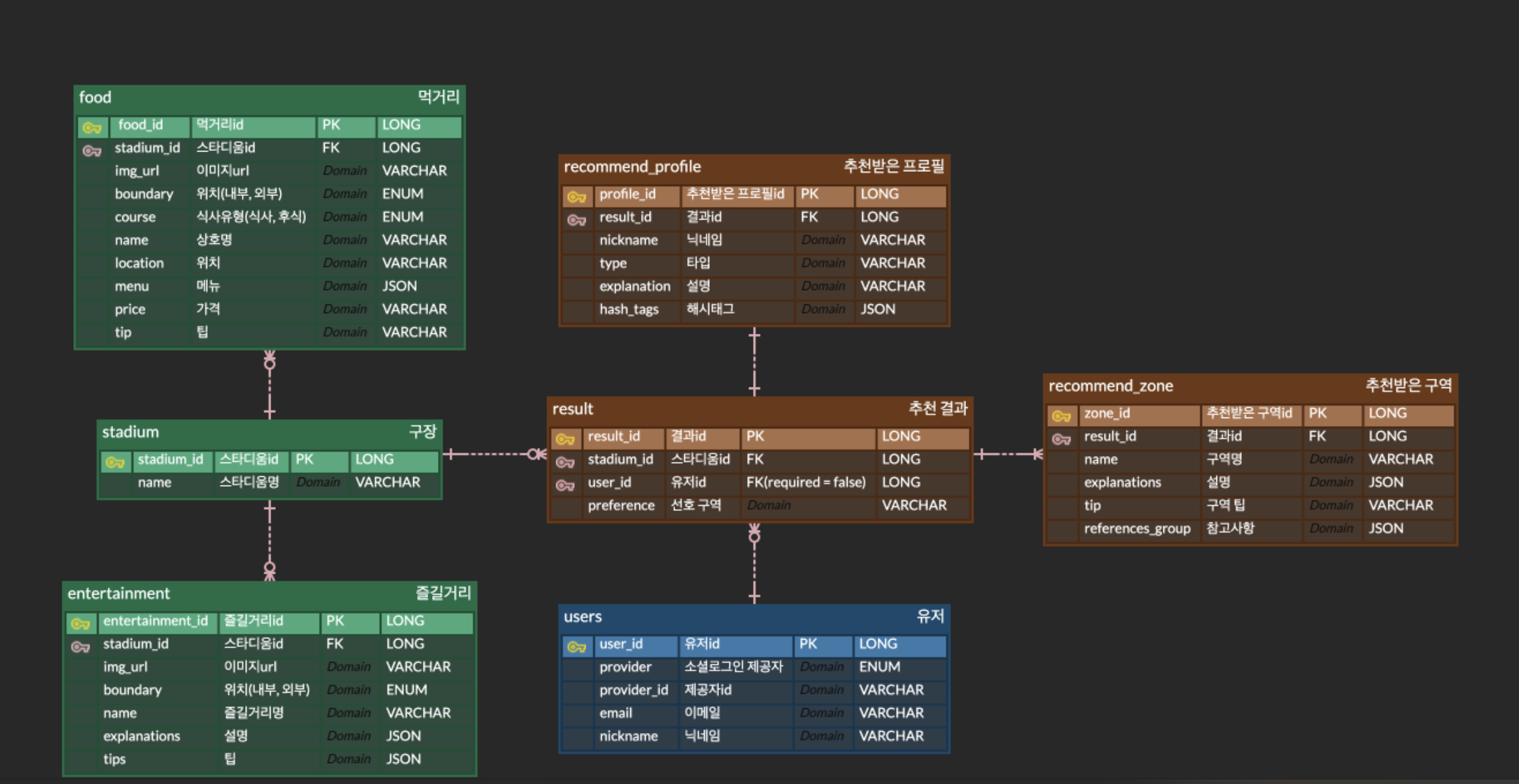 ERD는 위와 같았고, 우리는 유저의 접근성을 위해 로그인을 필수로 구현하지 않았기 때문에 유저보다는 다른 도메인이 중심이 된 모습을 띄었다.