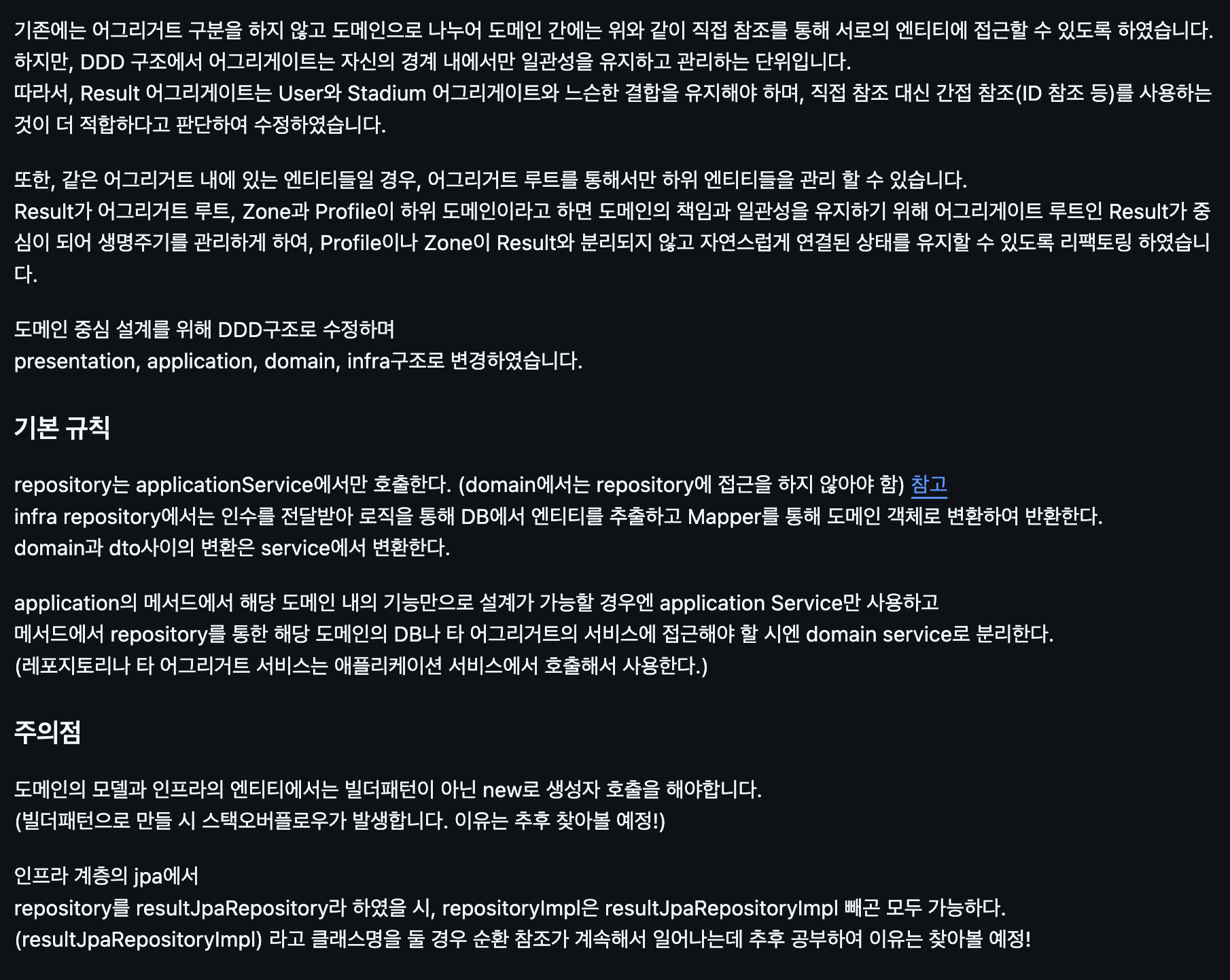기존 구조를 변경하는 경험도 머리가 많이 아팠지만 의미가 있었고, 이러한 경험들을 통해 초기 설계가 정말 중요하다는 점을 다시금 느낄 수 있었다.