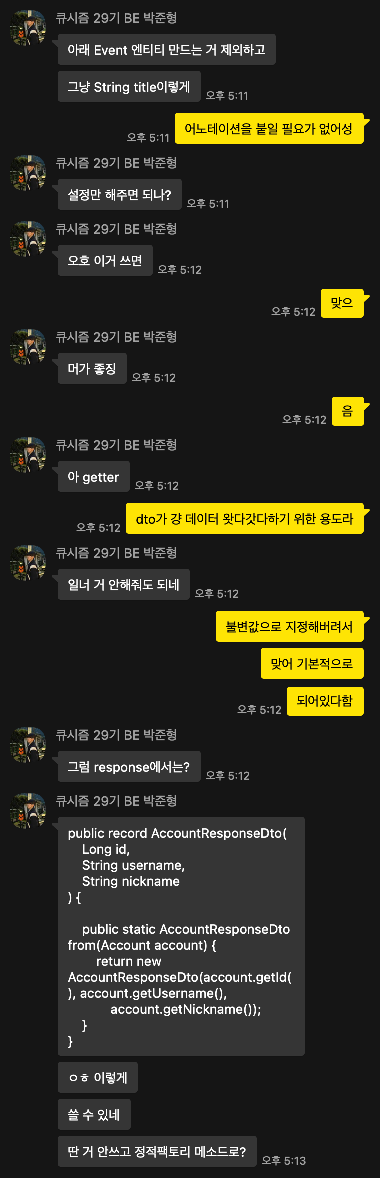 형은 이번에 백엔드가 처음이었기에 새로운 눈으로 코드를 바라봐주며 많은 질문들을 해주었는데, 덕분에 나도 내 코드에 대해 다시 고민해 보게 되고 이러한 과정을 거쳐 더욱 좋은 코드들을 작성할 수 있었다고 생각한다.