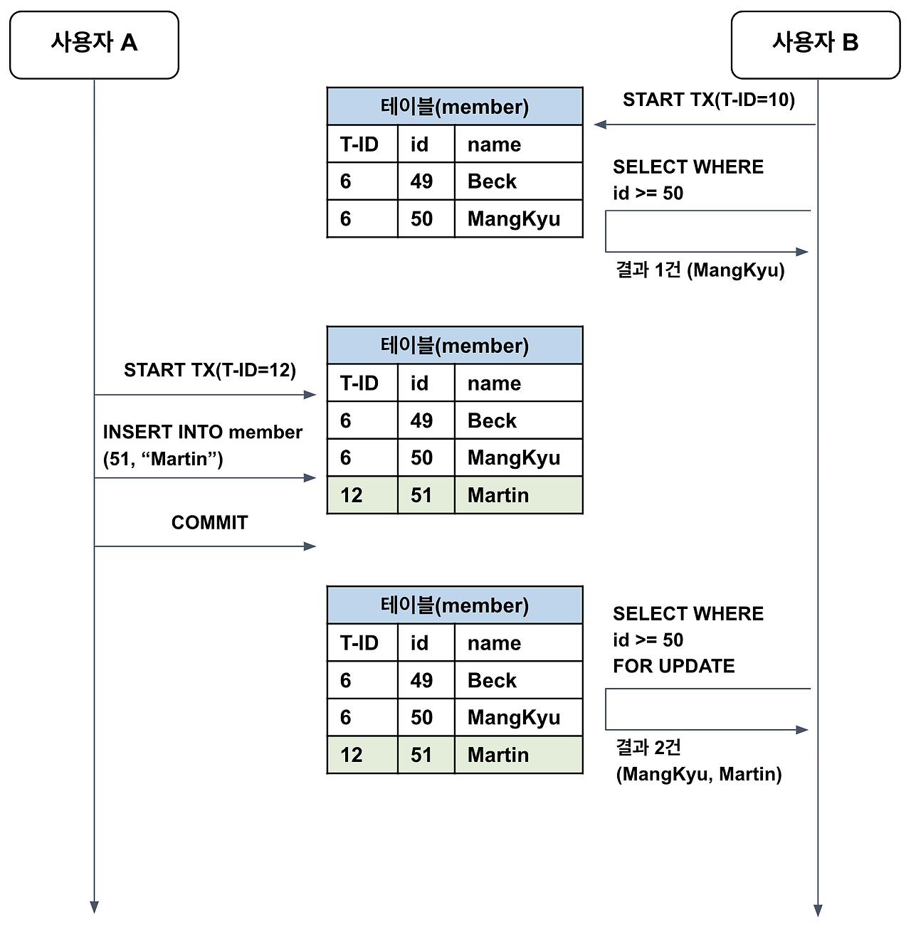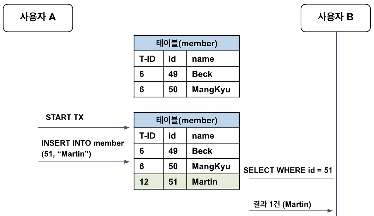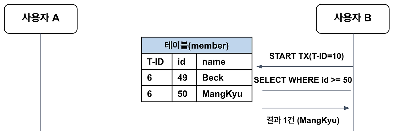 ์ด ์ํ์์ ์ฌ์ฉ์ B์ ํธ๋์ญ์ ์์ id=50 ๋ฉค๋ฒ์ ์ด๋ฆ์ ์กฐํํ๋ ์ฟผ๋ฆฌ๋ฅผ ์คํํ๋ค๊ณ ํด ๋ณด์.