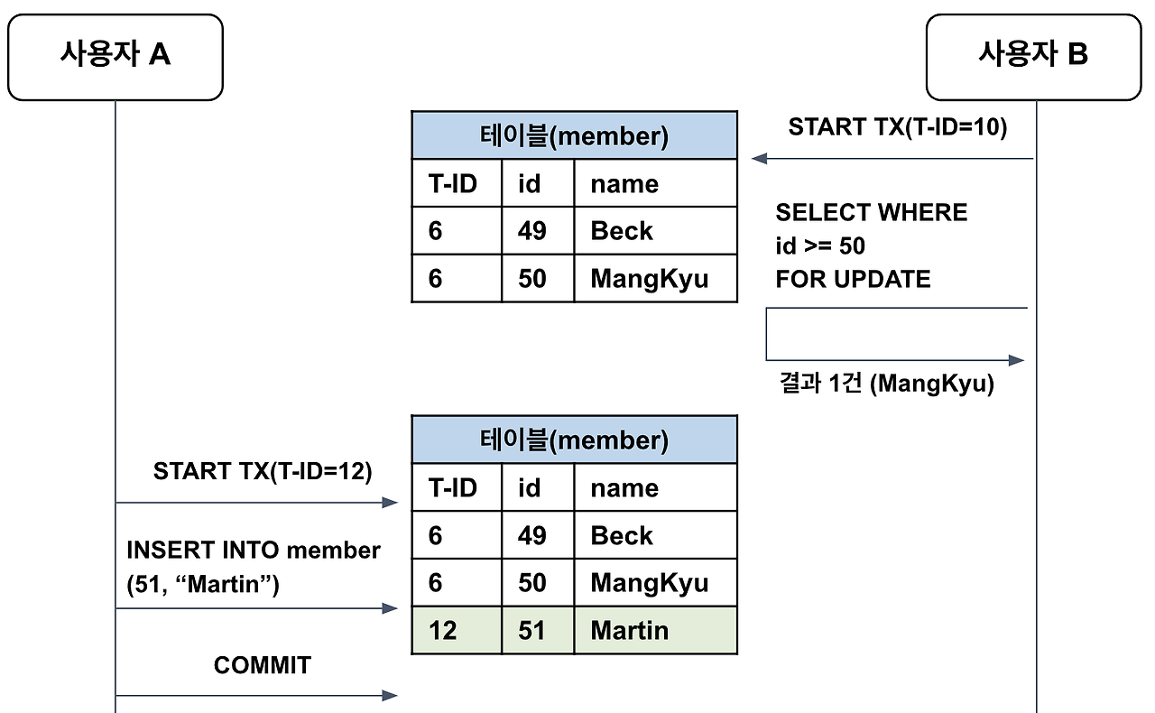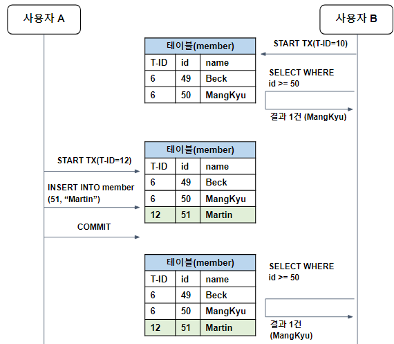 ์ ์ํด ์ถ๊ฐ๋ ๋ ์ฝ๋๊ฐ ๋ฐ๊ฒฌ๋ ์ ์๋๋ฐ, ์ด๋ฅผ Phantom Read