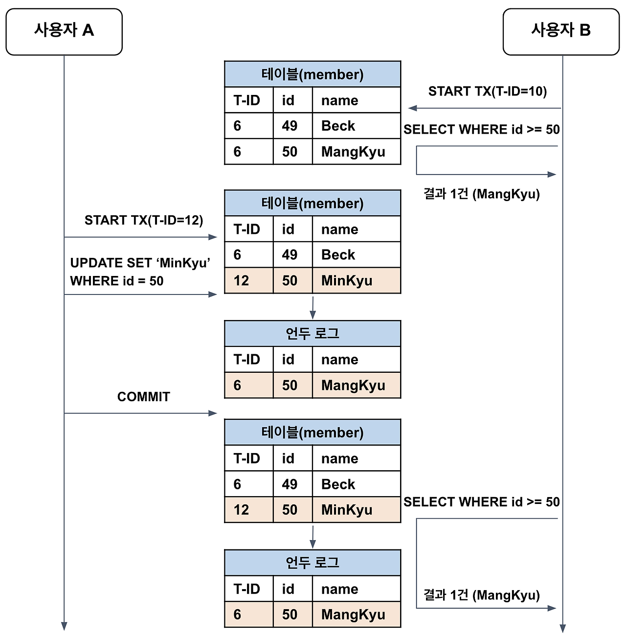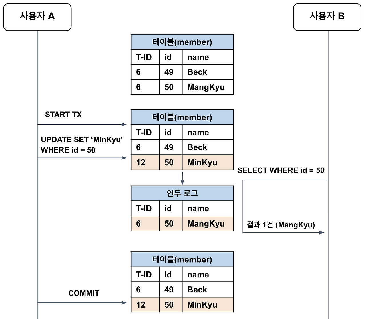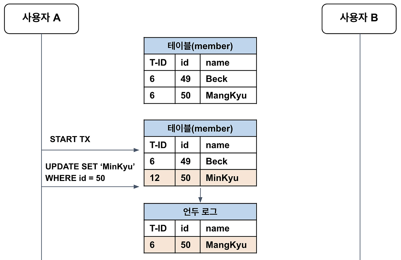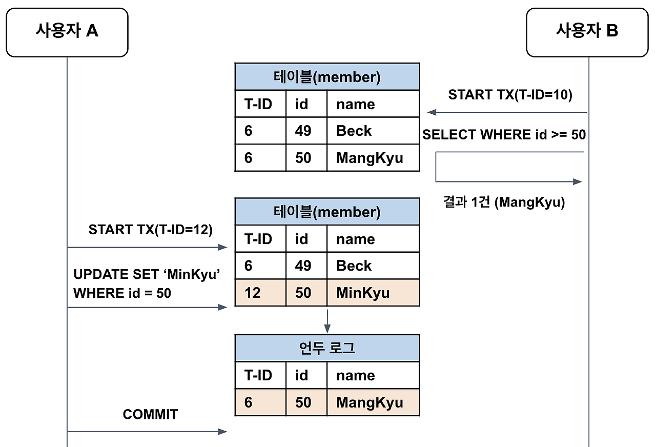 ์ ๋ฆฌํ์๋ฉด B ํธ๋์ญ์ ์ id๊ฐ 10์ด๊ณ A ํธ๋์ญ์ ์ id๊ฐ 12์ด๋ฏ๋ก, ํ ์ด๋ธ์ ๋ ์ฝ๋(MinKyu)๋ฅผ ๋ฐ๋ก ์กฐํํ๋ ๊ฒ์ด ์๋๋ผ / UNDO ๋ก๊ทธ์ ๊ธฐ๋ก๋ ๋ฐ์ดํฐ(ManKyu)๋ฅผ ์กฐํํ๋ ๊ฒ์ด๋ค.