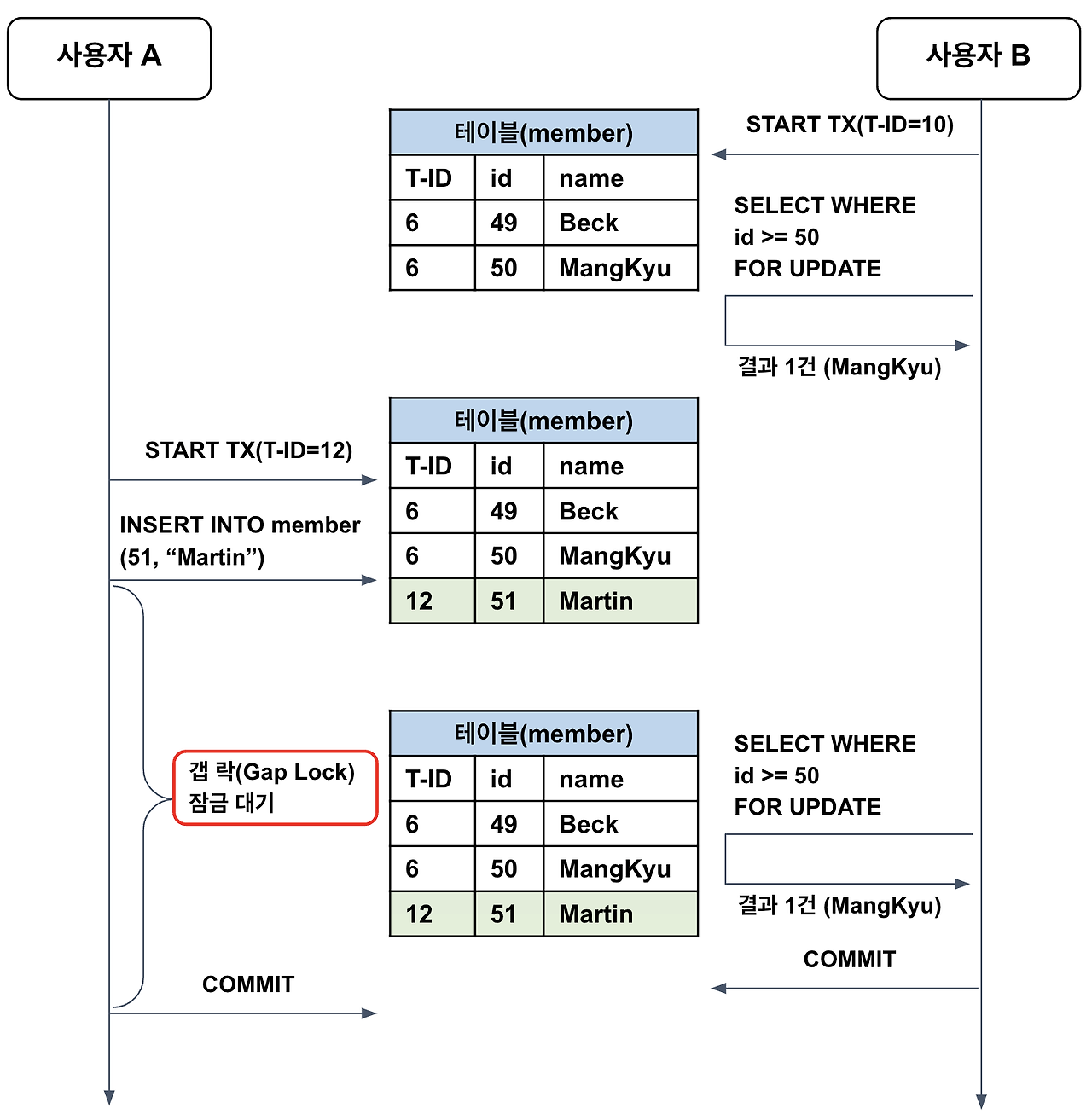 ์ด id๊ฐ 51์ธ member๋ฅผ INSERT ํ๋ ค๊ณ ์๋ํ๋ค๋ฉด, B ํธ๋์ญ์