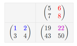 A행렬의 1행 첫번째 원소 1) X (B행렬의 2열 첫번째 원소6) = 6A행렬의 1행 두번째 원소 2) X (B행렬의 2열 두번째 원소8) = 16의 합으로 22라는 수가 결정되는 것이다.