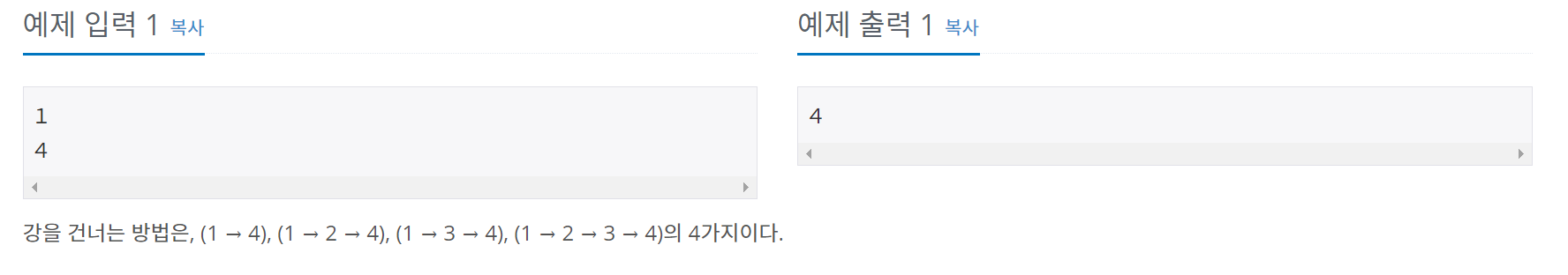 N == 1인 경우에 답이 1인 것도 잘 이해가 되지는 않았지만, 징검다리가 아닌 강 앞에서 시작을 하므로 (1) 자체로 1개의 가지수가 될 수도 있겠다는 생각이 들었다.느낀 점 & 배운 점