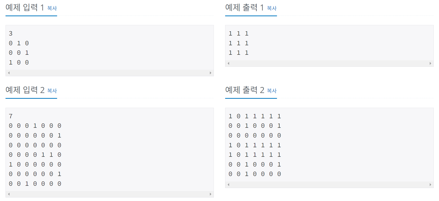 ์ฒซ์งธ ์ค์ ์ ์ ์ ๊ฐ์ N (1 โค N โค 100)์ด ์ฃผ์ด์ง๋ค. ๋์งธ ์ค๋ถํฐ N๊ฐ ์ค์๋ ๊ทธ๋ํ์ ์ธ์ ํ๋ ฌ์ด ์ฃผ์ด์ง๋ค. i๋ฒ์งธ ์ค์ j๋ฒ์งธ ์ซ์๊ฐ 1์ธ ๊ฒฝ์ฐ์๋ i์์ j๋ก ๊ฐ๋ ๊ฐ์ ์ด ์กด์ฌํ๋ค๋ ๋ป์ด๊ณ , 0์ธ ๊ฒฝ์ฐ๋ ์๋ค๋ ๋ป์ด๋ค. i๋ฒ์งธ ์ค์ i๋ฒ์งธ ์ซ์๋ ํญ์ 0์ด๋ค.