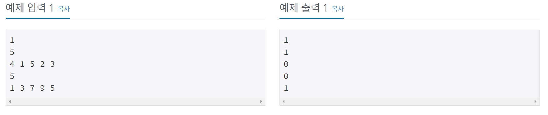 첫째 μ€μ ν μ€νΈμΌμ΄μ€μ κ°μ Tκ° λ€μ΄μ¨λ€. λ€μ μ€μλ βμ첩 1βμ μ μ΄ λμ μ μμ κ°μ N(1 β€ N β€ 1,000,000)μ΄ μ λ ₯μΌλ‘ λ€μ΄μ¨λ€. κ·Έ λ€μ μ€μ βμ첩 1βμ μ ν μλ μ μλ€μ΄ Nκ° λ€μ΄μ¨λ€. κ·Έ λ€μ μ€μλ βμ첩 2βμ μ μ΄ λμ μ μμ κ°μ M(1 β€ M β€ 1,000,000) μ΄ μ£Όμ΄μ§κ³ , λ€μ μ€μ βμ첩 2βμ μ μ΄ λμ μ μλ€μ΄ μ λ ₯μΌλ‘ Mκ° λ€μ΄μ¨λ€. λͺ¨λ μ μλ€μ λ²μλ int λ‘ νλ€.