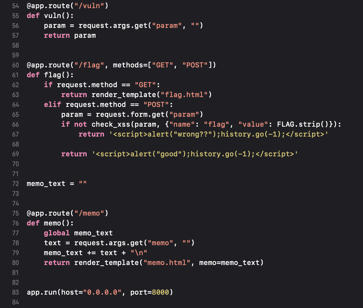 주어진 코드를 보면 /vuln은 사용자가 입력한 param 값을 그대로 출력하는 것을 알 수 있다.