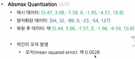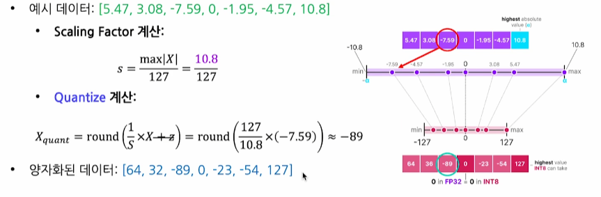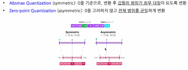 | Absmax Quantization | 절대값의 최대값 | 대칭 | 0이 중요한 경우 | 극단적인 값에 예민 |