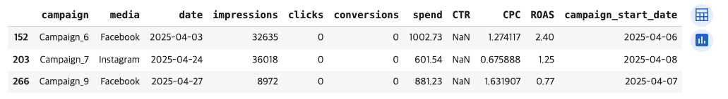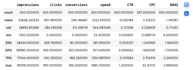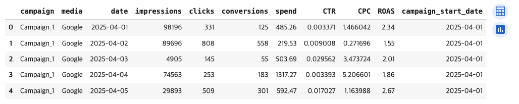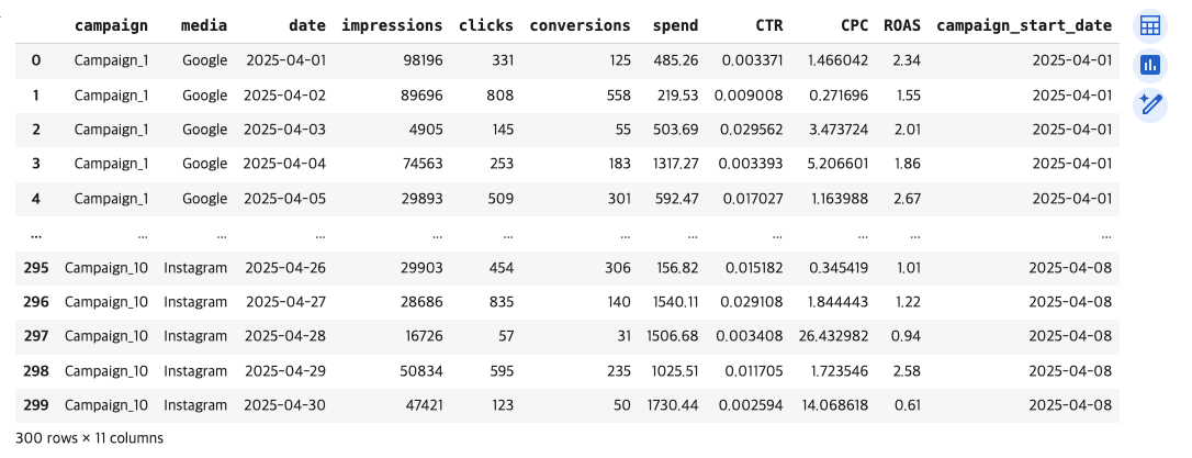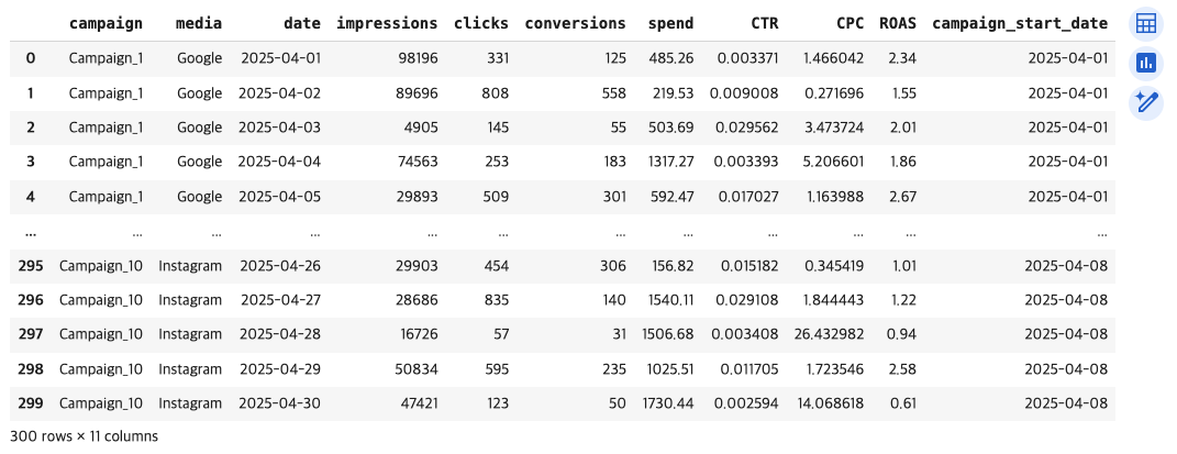 광고 캠페인 성과 데이터(CTR, CPC, ROAS, conversion_rate 등)를 불러오고,