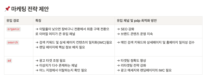 - 각 유입 경로에 따른 전략적 최적화 및 A/B 테스트 기반 개선 체계화 필요