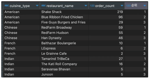 음식 타입별로 주문 건수가 가장 많은 상점 3개의 데이터를 가져오고 싶다.