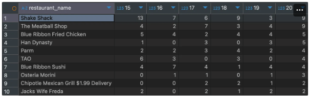 이때 나는 음식점 별 15시부터 20시 사이의 시간의 주문 건수 데이터를 20시 주문건수 기준 내림차순으로 가져오고 싶다.