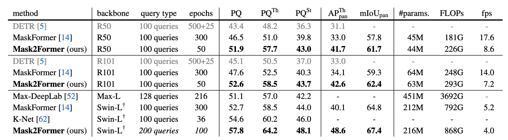 57.7 mIoU on ADE20K, 57.8 PQ on COCO