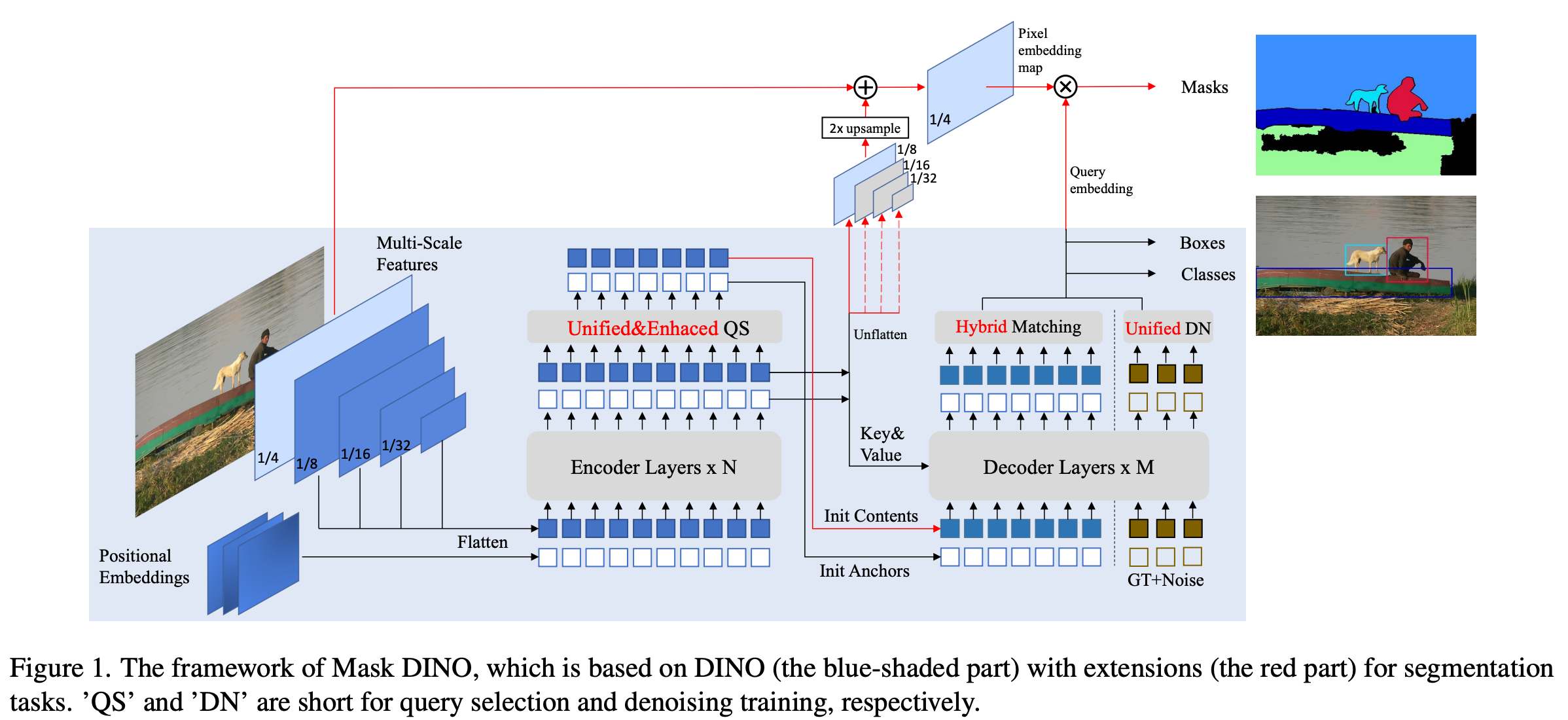 - backbone 과 transformer encoder 로부터 얻어진 high-resoluion pixel embedding map 에서 모든 segmentation task 에 mask classification 을 수행하기 위해서 DINO 에서 나온 content query embedding 을 재사용함